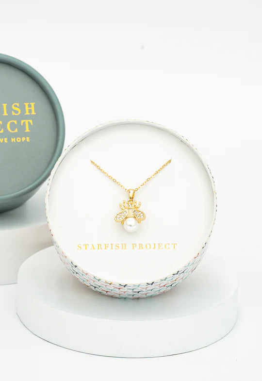 Our 14K plated gold Queen Bee Pearl Necklace is the perfect accessory to add a little sparkle, fun, and elegance to every look! Not only will you shine with pearl and zircon accents, but you'll also make a positive impact on the lives of the incredible women at Starfish Project. Shop now and join us in creating a better world for women everywhere.