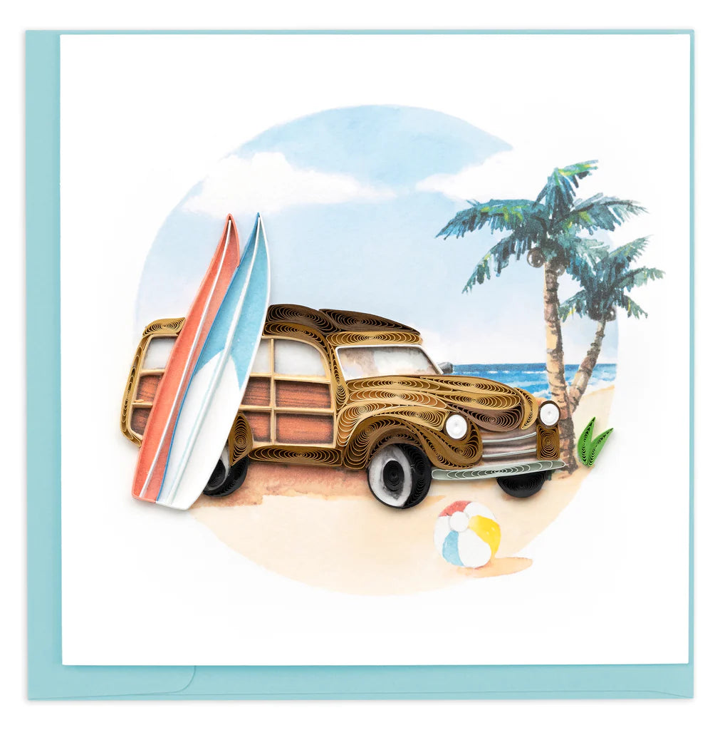 Oh the memories! This hand crafted classic Woodie car is sure to take you back to those summer vacation with the family. This iconic wagon is on a beautiful water colored beach setting. It a perfect day to hang ten!