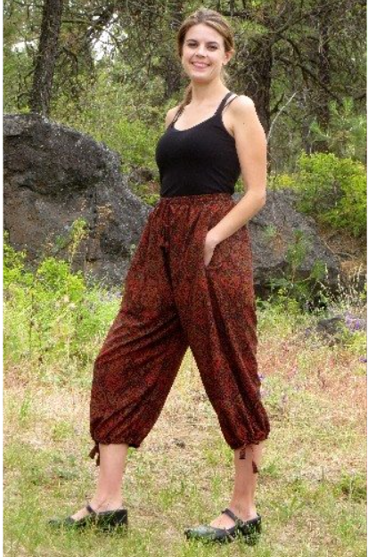 Recycled silk sari three-quarter length pant. Drawstring at waist and calf , and it has pockets! Comes in S-XL; available in assorted patterns and colors.