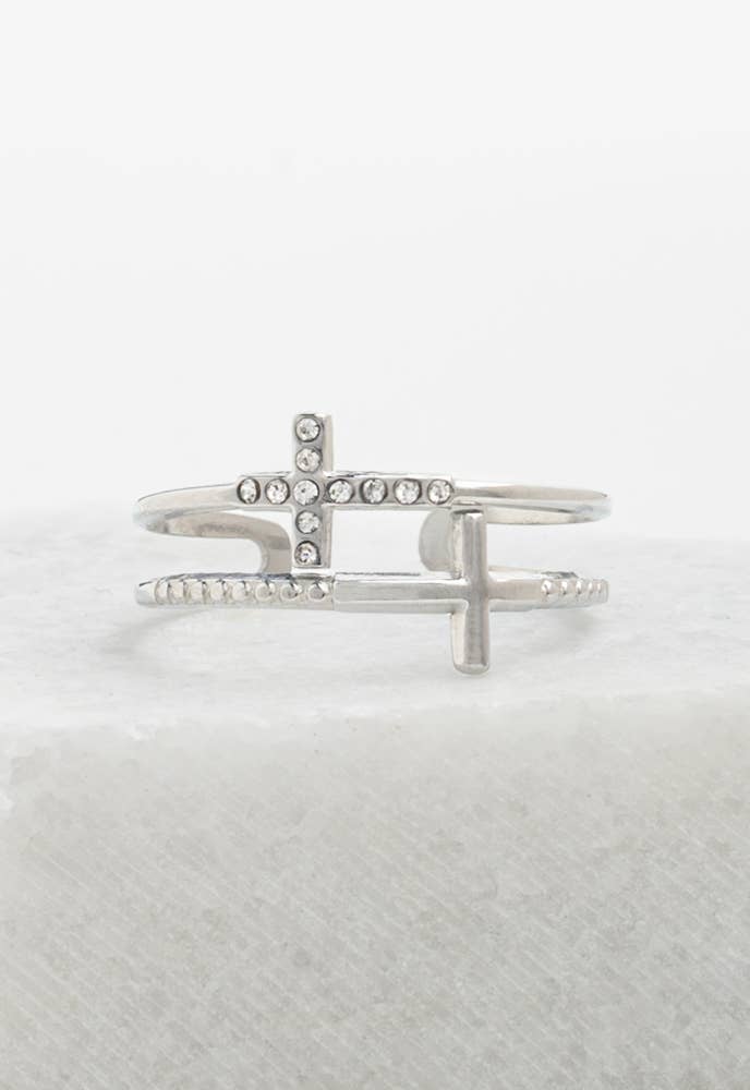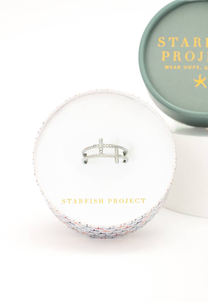 Elevate your style with our Silver Cross Serenity Ring. Our ring combines a timeless symbol of faith and elegance. Designed for everyday wear, the adjustable Silver Cross Serenity Ring adds a touch of grace to any outfit! Enjoy your ring knowing your contribution helps create a positive impact in the lives of women and girls. Box size and color may vary. Materials: Stainless steel with zircon ring Hypoallergenic; lead and cadmium free with nickel content less than 100 ppm. Size: 2.5 inches.
