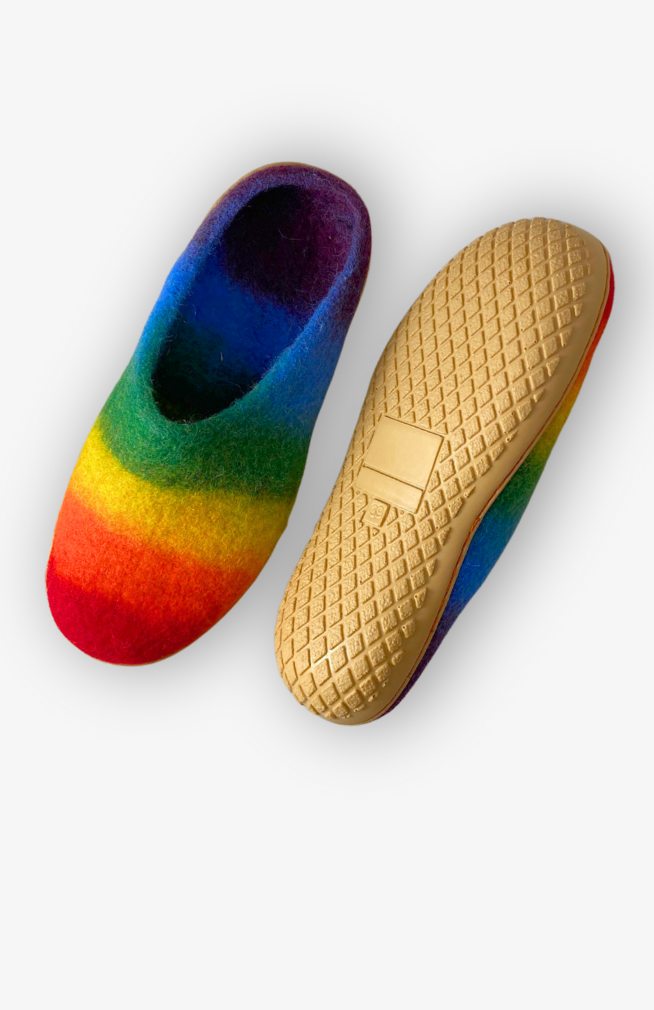 These adorable felted wool slippers are cute, cozy and they make a statement! Put a rainbow in your life! Great for folks who have visitors leave their shoes at the door. They can slip them on and enjoy! Full leather sole for long wear. Made in Nepal.
