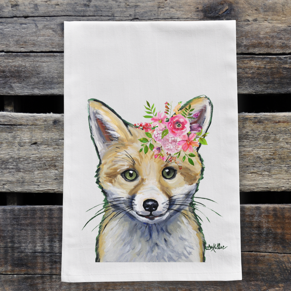 Spring Flower Fox Tea Towel, Woodland Animal Decor