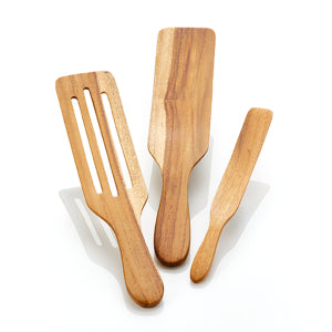 This handmade teak wood spurtle set is cut, sanded, and polished to perfection. Food safe. Set features two long spatulas and a long turner.Dimensions: Largest: 12"l x 2 1/2"w.