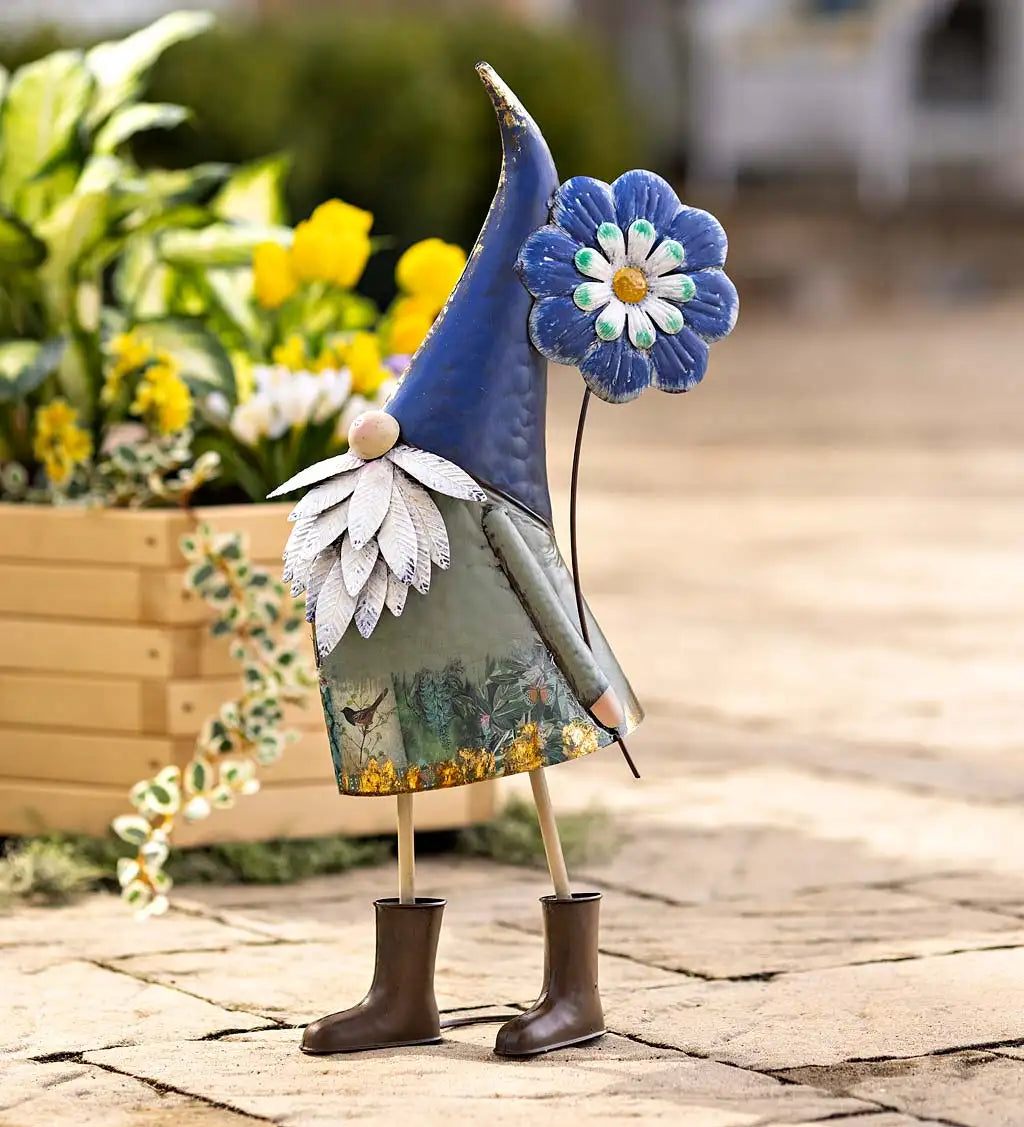 Statuary, Metal Gnome Holding Blue Flower