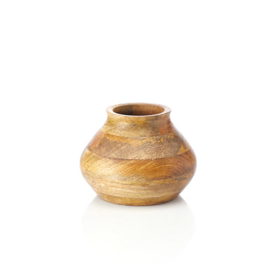 This artisan-made vase can be displayed as a statement piece or artfully arranged with flowers, grasses, or berry-studded branches. Formed from layered mango wood, joined and turned for a smooth finish. Recommended for use with artificial or dried foliage only; not watertight. 6 1/2"h x 7 1/2"dia.