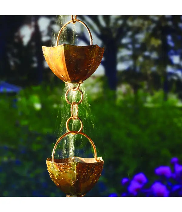 A fascinating alternative to the simple downspout. Rain chain catches rooftop water flow and creates its own watercourse, as water runs down the chain through a succession of 11 copper-colored cups.