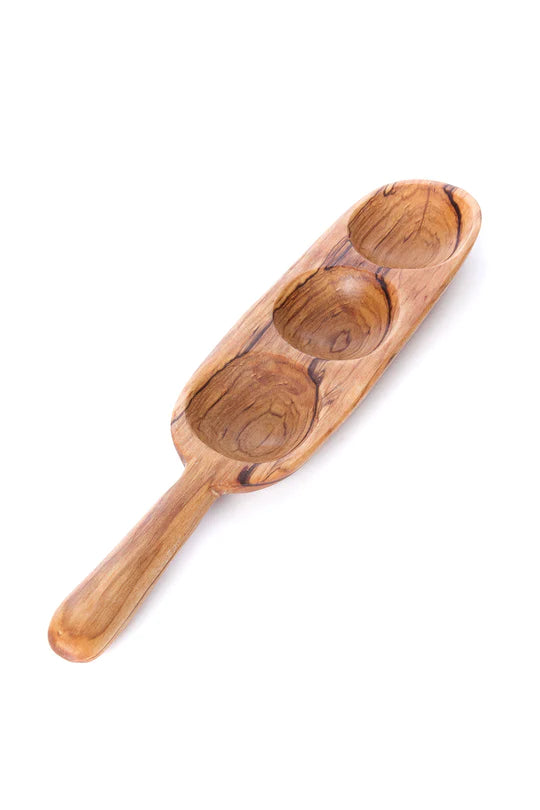Kenyan artisans hand carve unique serving trays from beautifully grained wild olive wood. Available in two sizes, each tray features three wells for condiments, spices, sweets and more, as well as a substantial handle.